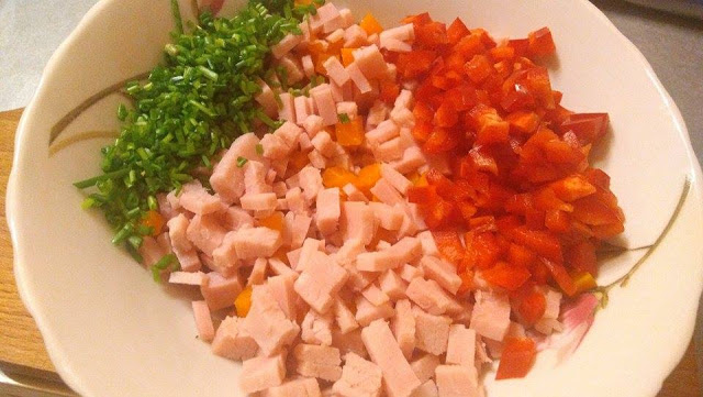 Kroimy w kostkę nasze kolorowe składniki czyli według uznania paprykę, szynkę, marchewkę, zieleninę.