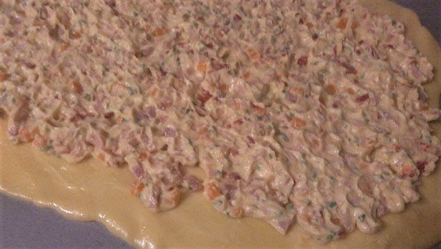 Na placek serowy smarujemy nasza masa i… zwijamy.