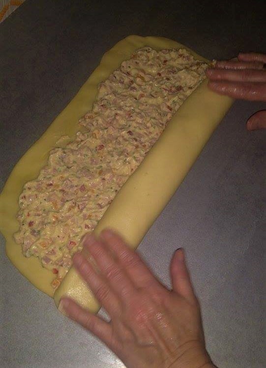 Na placek serowy smarujemy nasza masa i… zwijamy.
