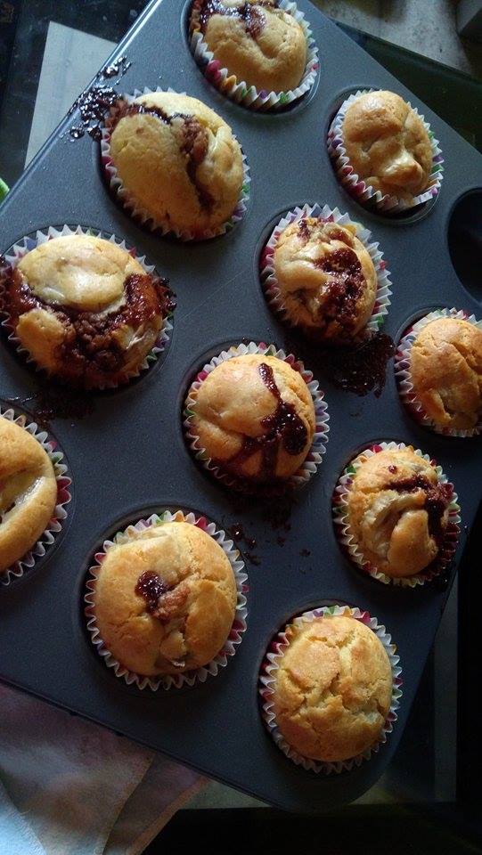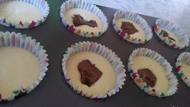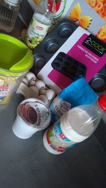 Jakiś czas temu kupiłam synowi krem czekoladowo-orzechowy, jednak nie spotkał się on z zachwytem i tak leżał w szafce i leżał. Postanowiłam się go pozbyć (żeby mnie nie kusił!). Wybór padł na babeczki. Przepis całkiem prosty, a krem czekoladowy możecie zastąpić kostką czekolady czy jakimś owocem.