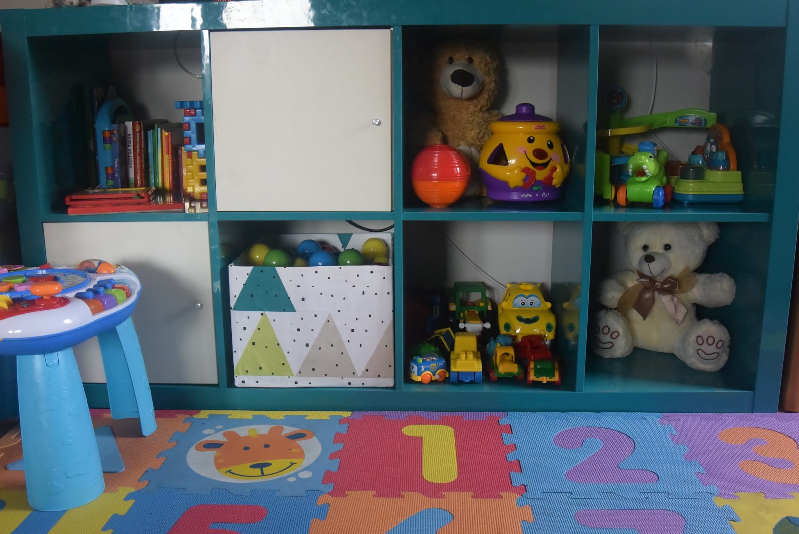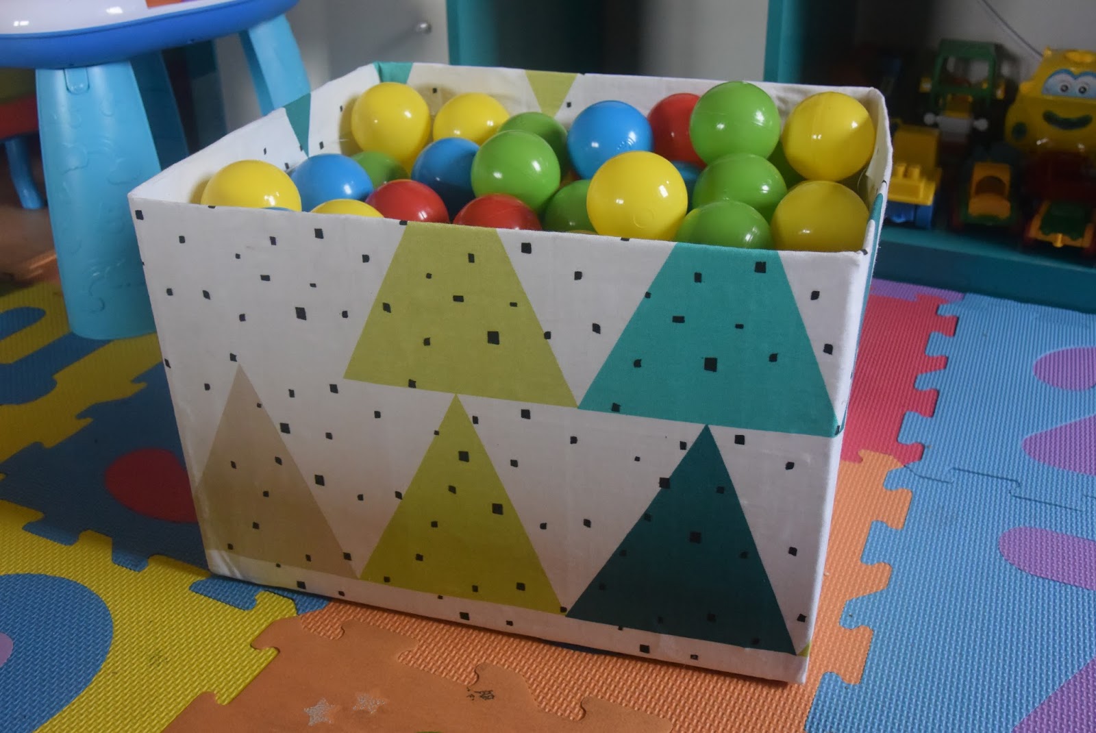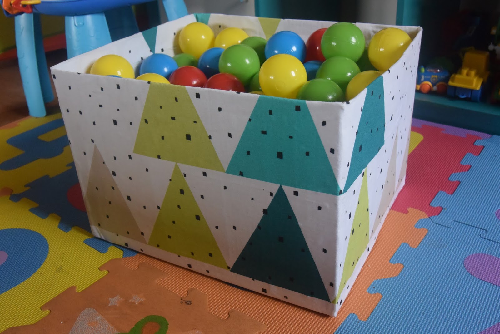 Dzieć uwielbia kartony chyba od zawsze, pakował w nie zabawki, sam do nich wchodził, nosił je z kąta w kąt i w końcu jakoś tak zostało, że zabawki segregowaliśmy w kartonach po pampersach. Dodatkowo pasują niemal idealnie do regału Dziecia. Tyle tylko, że wyglądają fatalnie!