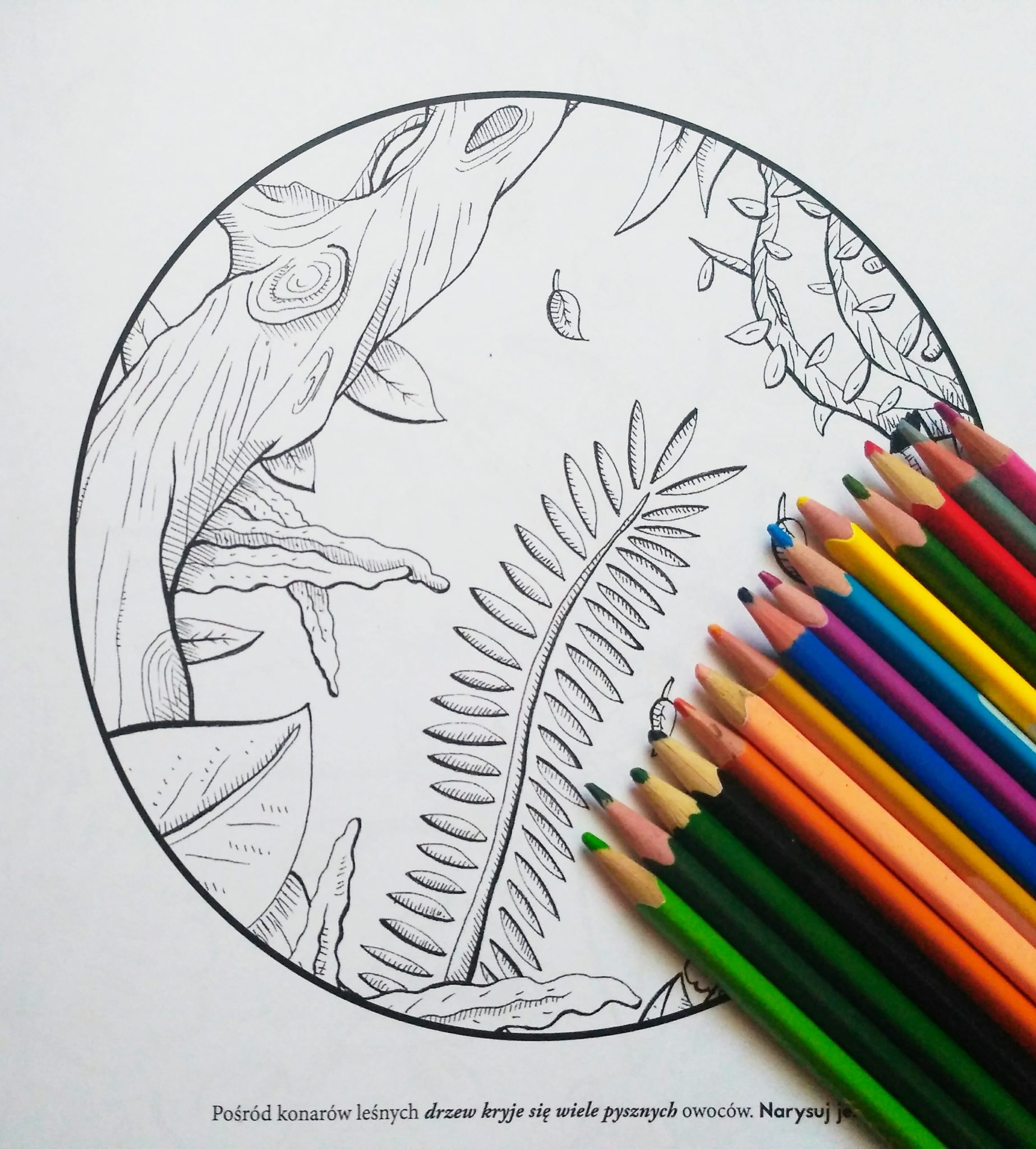 Zmorek stał się naszym przyjacielem już dawno. W książce „Niesamowity Zmorek. Pokoloruj jego świat” znajdziemy kolorowanki, które moim zdaniem, są przeznaczone dla troszeczkę starszych dzieci niż dla mojego trzylatka. Ilustracje zawierają sporo szczegółów, liści, listków, gałązek, ale mimo wszystko Szymon bardzo chętnie zaczął książkę przeglądać i przymierzać się do kolorowania.