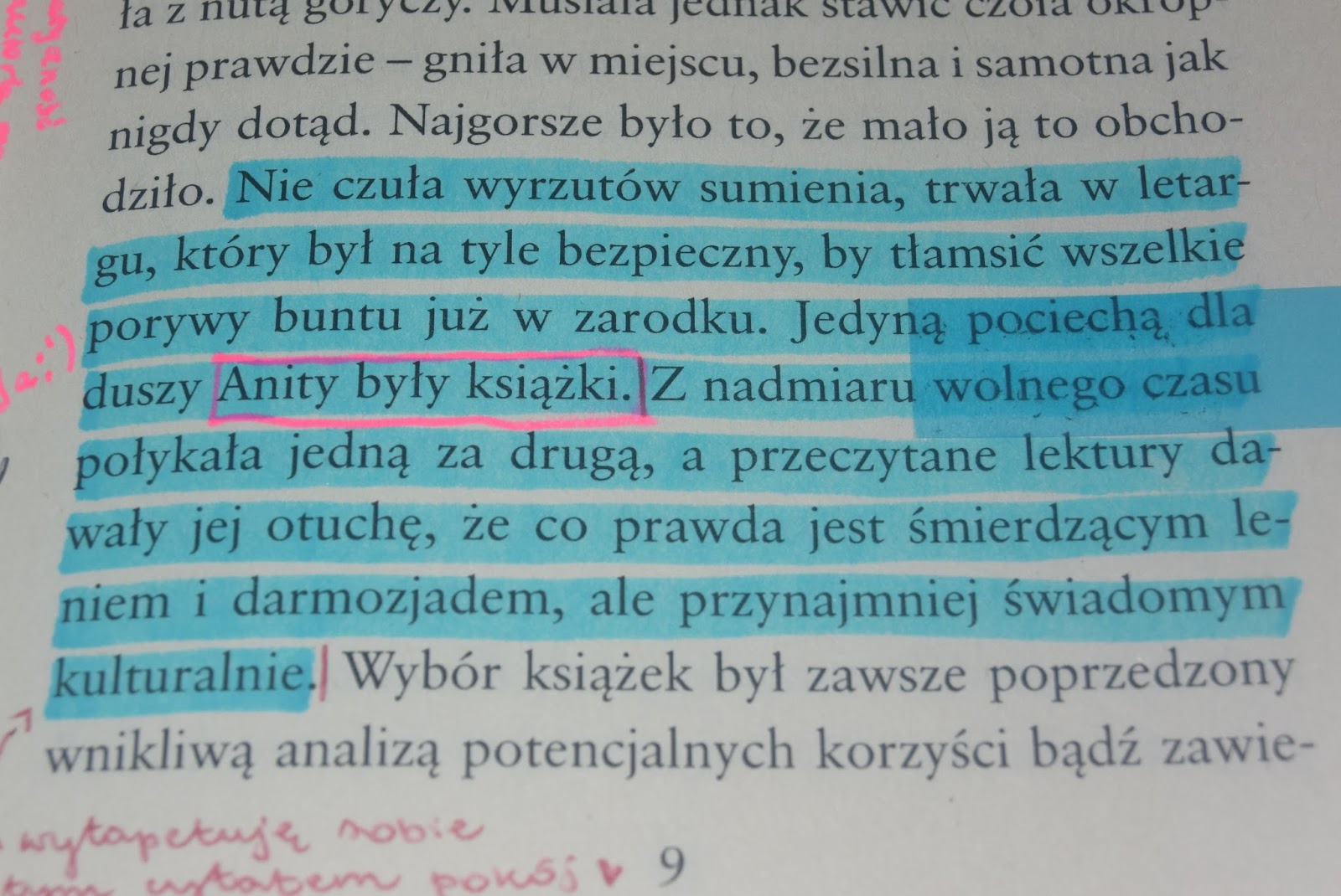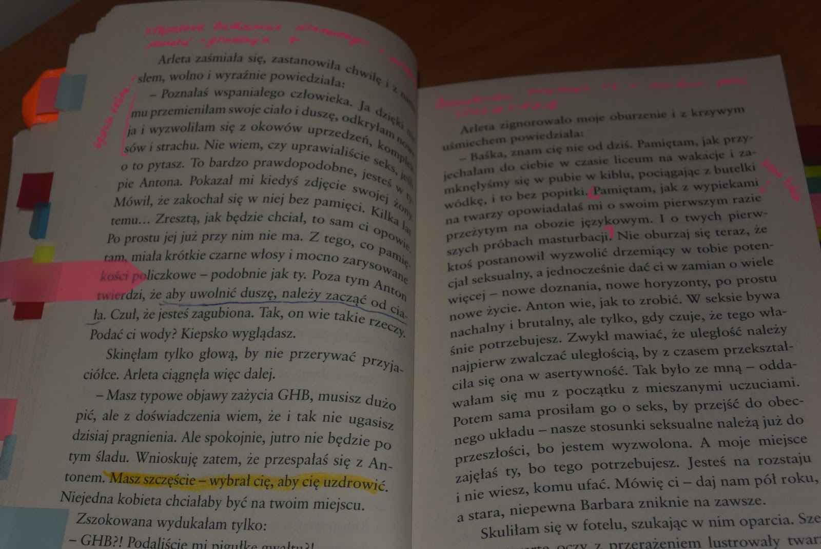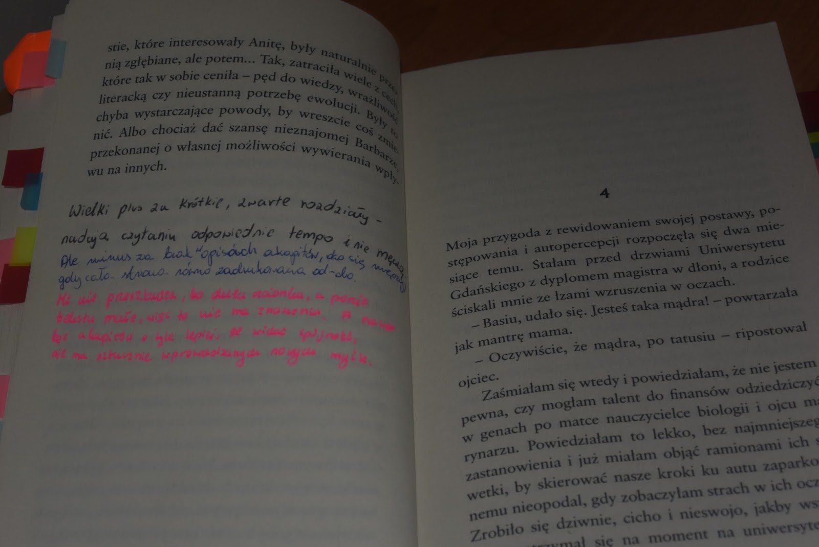 Na zdjęciach widać, że dotarła do mnie książka z uwagami na marginesach, z zaznaczonymi fragmentami, poprawkami, komentarzami i całym mnóstwem zakładek. Przyznaje, że w takiej akcji brałam już udział wiele razy, ale książek w takim stanie nie czytałam. No i nieco mnie te wszystkie „ozdobniki” rozpraszały, więc najpierw czytałam rozdział, potem wracałam do zaznaczonych i skomentowanych fragmentów.