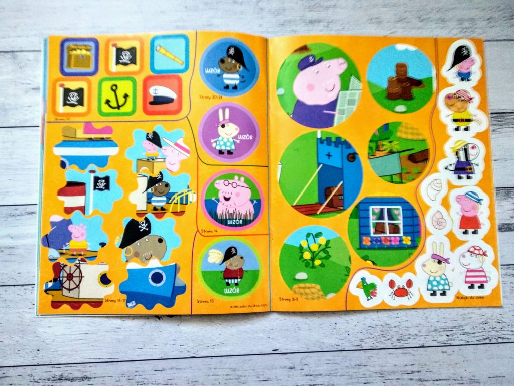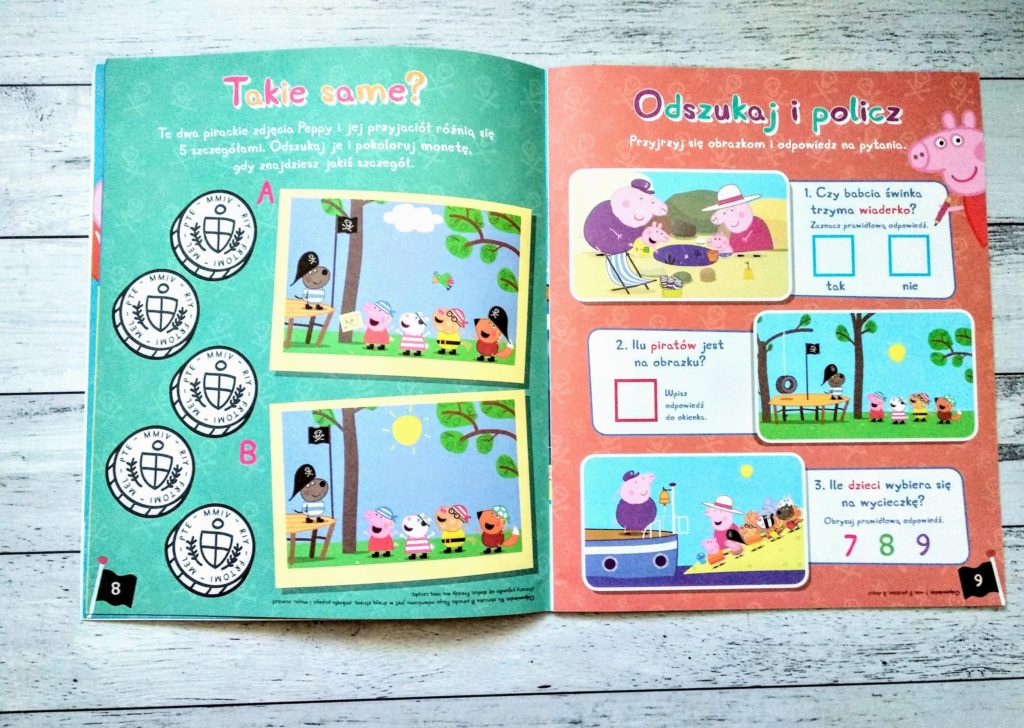 Natomiast książka z zadaniami to „Peppa Pig. Chrum chrum piraci”. Takie książki lubimy najbardziej, kolorowanki nigdy się u nas nie sprawdzały. Ale już polecenie dopasowania przedmiotów, pokolorowania odpowiednich elementów, znalezienie mniejszych lub większych przedmiotów, a do tego naklejki – to jest to! Takie książki sprawiają radość nie tylko dzieciom, ale i rodzicom, bo maluchy mają szansę się rozwijać!