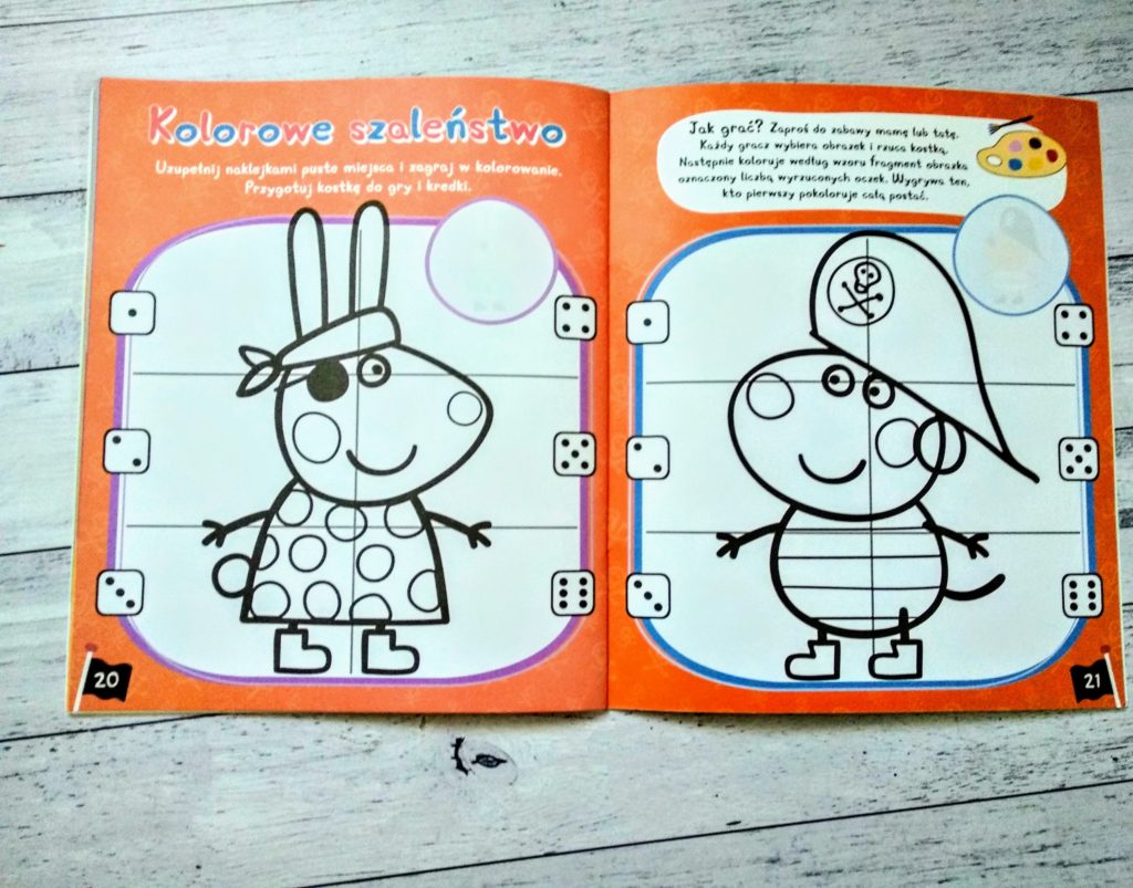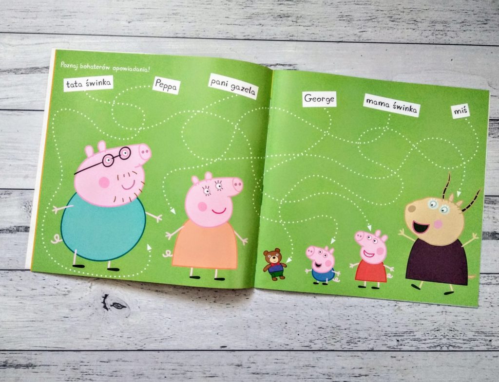 Muszę przyznać, że początkowo ta bajka nie zrobiła na mnie dobrego wrażenia, natomiast w telewizji jest tak dużo kreskówek i seriali dla dzieci, które są po prostu ogłupiające, że na liście bajek dozwolonych znalazła się Peppa. Aby jednak nie pozwolić dziecku spędzać zbyt wiele czasu przed telewizorem staramy się jak najczęściej sięgać po książeczki. I tak wylądował u nas poniższy komplet: jedna z nich to książka do czytania, druga do uzupełniania. Obie od Media Service Zawada (kiedy klikniesz przekieruje Cię na ich stronę, a tam jest również sklep online).