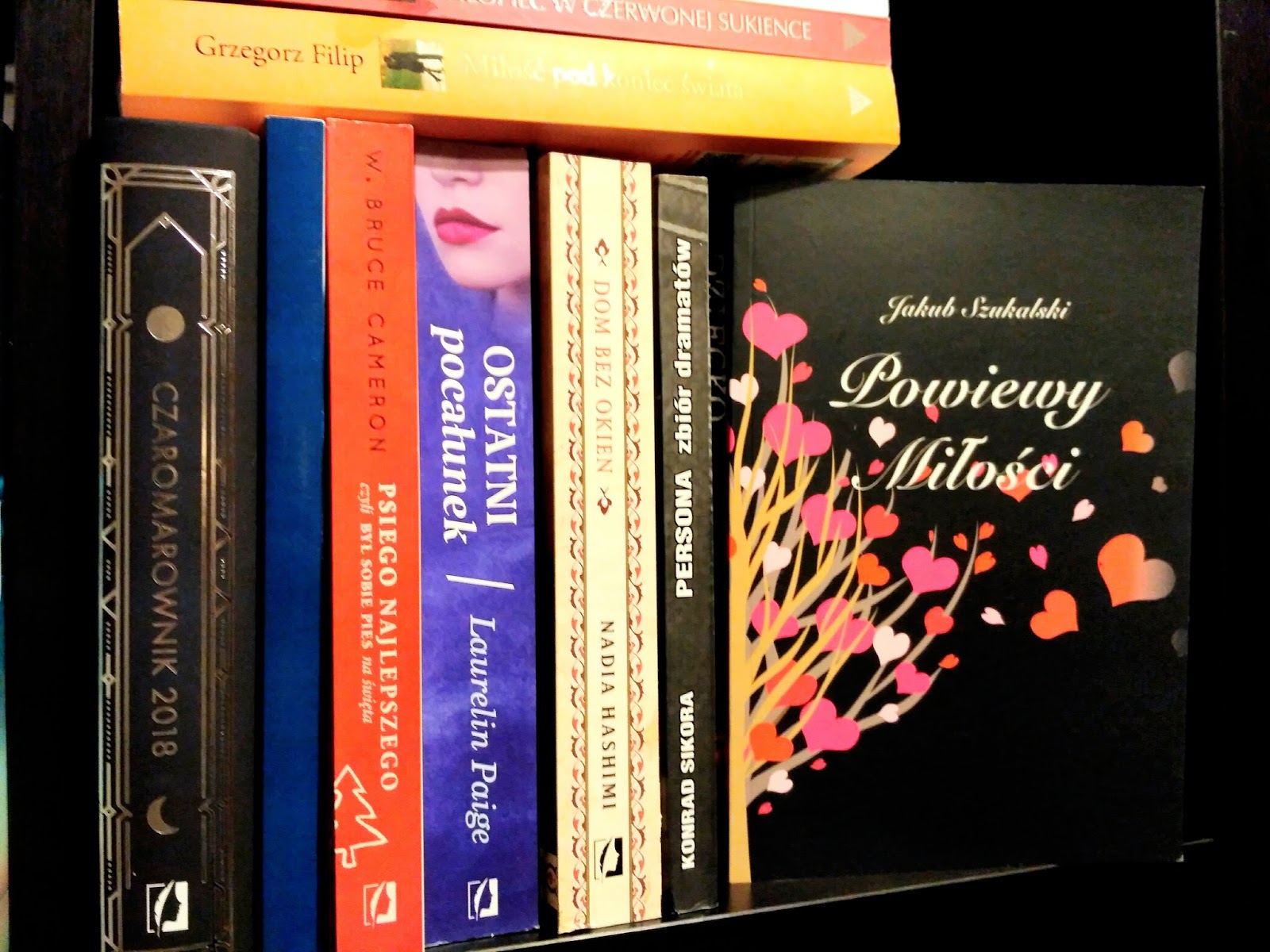 Nie wiem, czy okładka jest z plusem czy minusem tego tomiku… jest prosta, pewnie gdybym trafiła na nią w księgarni to bym się zastanowiła, czy po nią sięgnąć, ale kiedy stoi na mojej półce… no prezentuje się całkiem ciekawie, mam osobną półkę na tomiki wierszy i myślę, że jest mu tam dobrze.