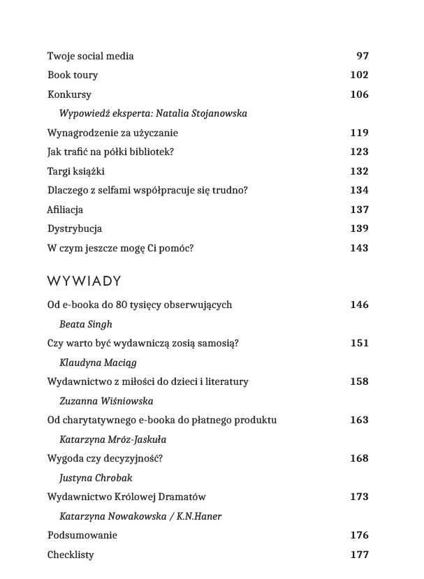 Miałam przyjemność napisać wstęp o promocji do książki „Wydaj i nie oszalej. Rozmowy o self-publishingu” Katarzyny Mróz-Jaskuły, a w 2023 roku wydałam książkę „Promocja? Tak, poproszę! Jak samodzielnie wypromować książkę/e-booka” (najpierw jako e-book, a w czerwcu w wersji papierowej).