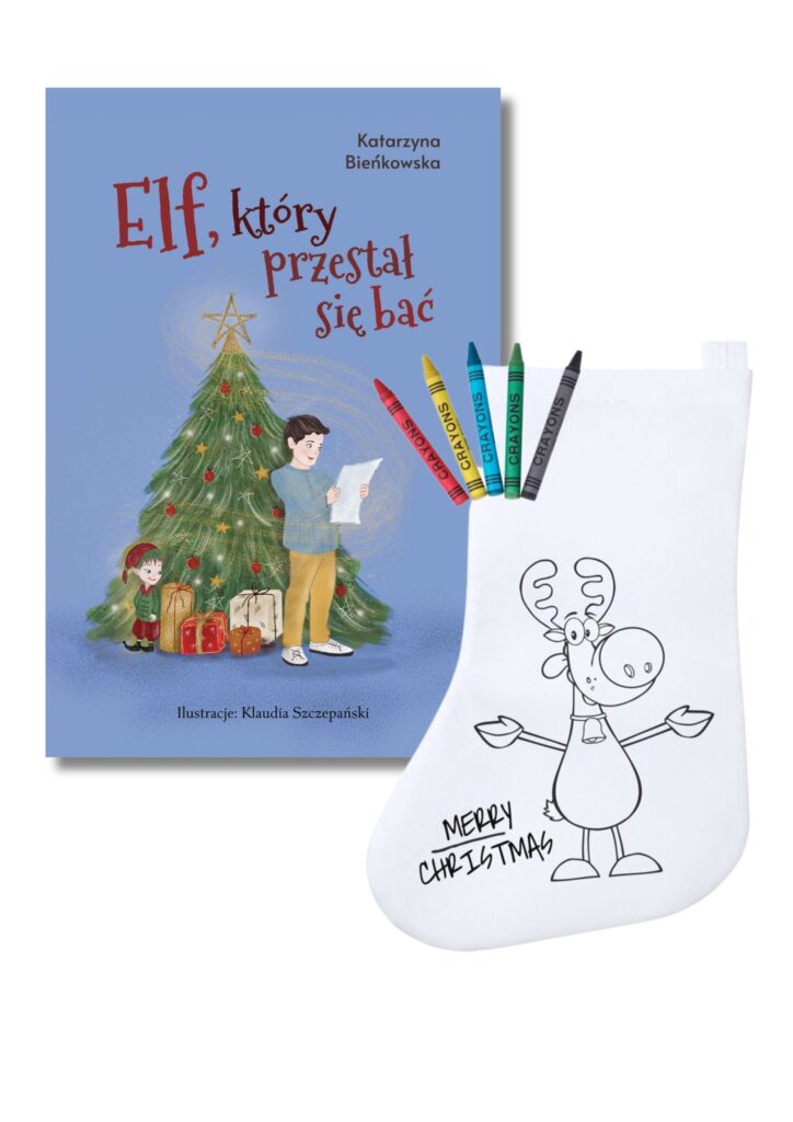 Pakiet zawiera książkę „Elf, który przestał się bać” oraz materiałową skarpetę, którą dziecko może samodzielnie pokolorować kredkami dołączonymi do pakietu.