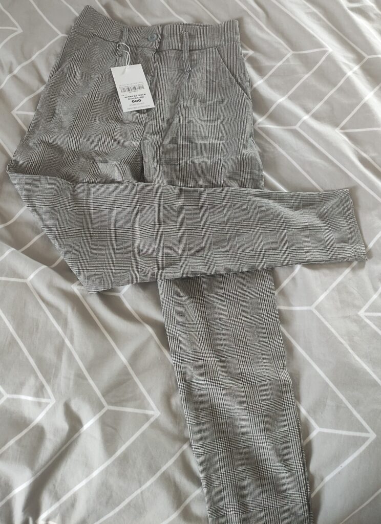 A teraz gwóźdź programu, czyli spodnie cygaretki! Zawsze trochę się boję, że zdjęcia przekłamują np. kolor i w rzeczywistości coś z wzorem będzie nie tak, ale przyszły idealne! Wzór na materiale jest świetny i naprawdę elegancki. W dodatku przy moim wzroście maja idealną długość, choć powinny być krótsze i dla wysokich osób właśnie takie będą. Z racji tego, że jestem niewysoka to większość spodni muszę skracać czego bardzo nie lubię. Tutaj nie musiałam sobie zawracać tym głowy na szczęście! Świetne, wygodne, eleganckie!