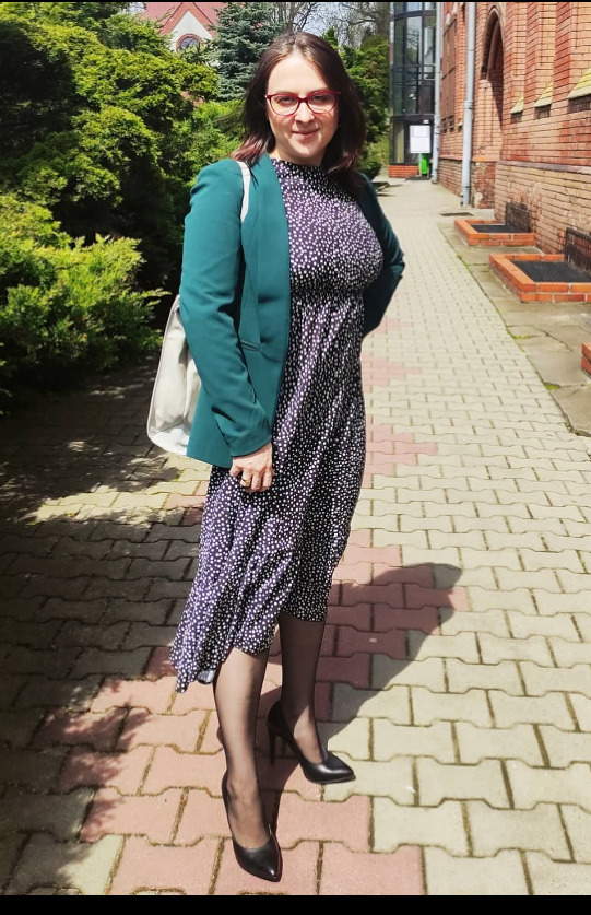 Sukienka w kropeczki wydała mi się niezwykle urocza! Brak dekoltu dodaje jej powagi, ściągacz pod biustem maskuje wypukłości, które chcemy ukryć. A długość za kolano dodaje powagi. Jeśli o mnie chodzi to jest idealnie! Do tego wysoki obcas i mogę podbijać świat!