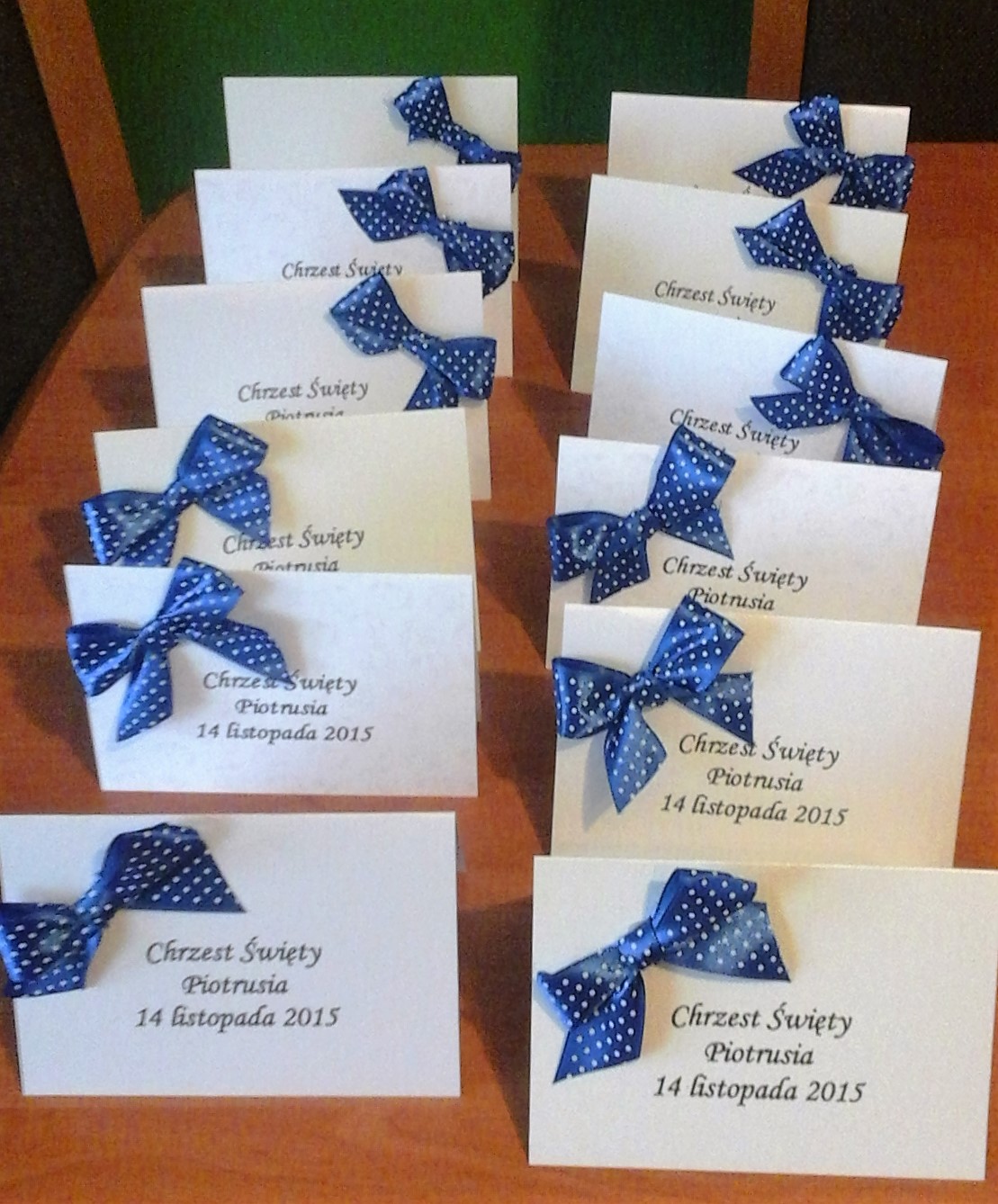 Co prawda znalezione przez siostrę kartki miały inne, mniejsze kokardki, a do tego wózeczki w odpowiednim kolorze… ale bazując na moich zbiorach w oko wpadła jej kropeczkowa wstążka, więc dodatkowe elementy uznałyśmy za zbędne.